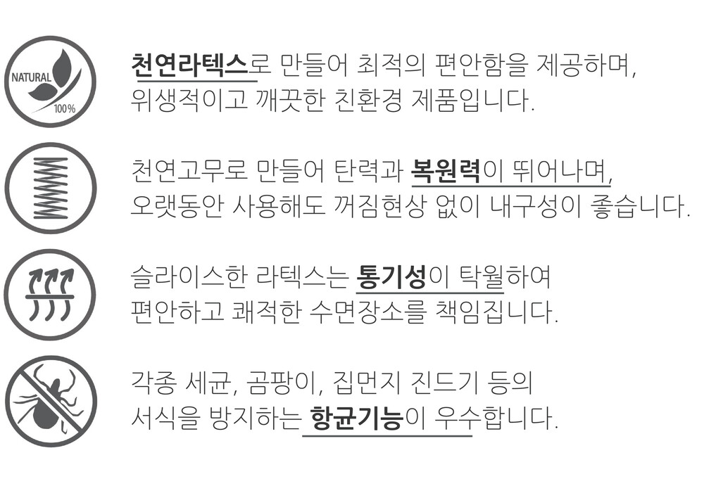 천연 라텍스는 오래 사용해도 먼지가 나지 않고 항균기능이 뛰어나 각종 세균, 곰팡이, 집먼지 진드기 등을 원천 봉쇄합니다.