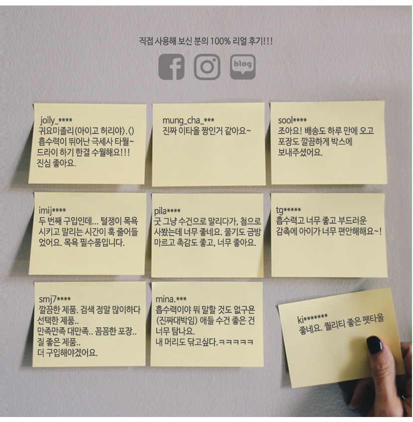 - 섬유 유연제 사용 시 부드러운 촉감과 흡수율이 떨어질 수 있으니 사용을 금지해주세요.
